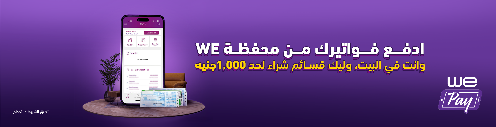 - للإشتراك في العرض، يجب أن يكون الحد الأدنى لقيمة المعاملة المالية الواحدة 100 جنيه على محفظة WE .